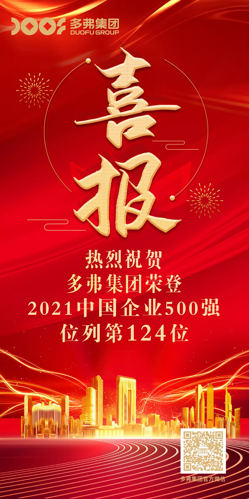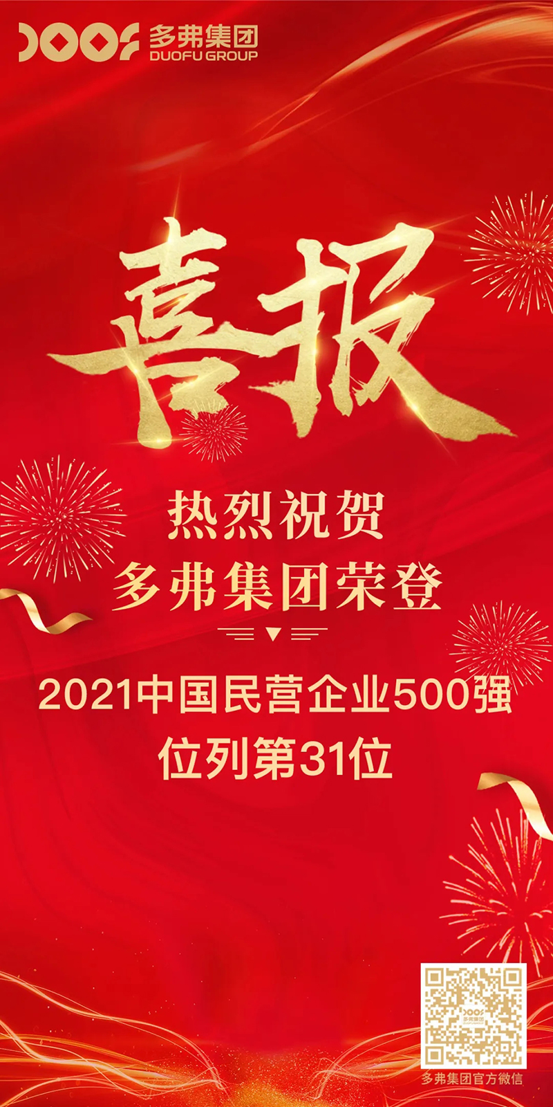 同日,全國工商聯(lián)在長沙發(fā)布《2021中國民營企業(yè)500強(qiáng)榜單》,多弗國際控股集團(tuán)再次蟬聯(lián),以1909.1564億元營收位居第31位。