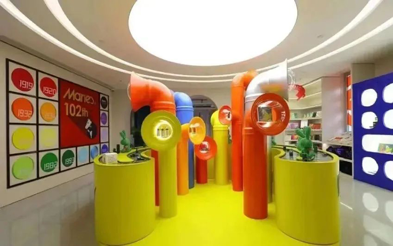 Mamǎfufú將“小紅閑”這一概念發(fā)揮得淋漓盡致,無論是整體的場(chǎng)景風(fēng)格,對(duì)于色彩的靈活運(yùn)用,還是互動(dòng)體驗(yàn)的內(nèi)容和品牌首店引入,都創(chuàng)造了極高的出片效果,吸引眾多年輕人前來打卡消費(fèi)。Mamǎfufú超級(jí)百貨是一個(gè)跨界聯(lián)合的潮流文創(chuàng)空間,占據(jù)了M+馬利位置最好的沿街二樓,無論室外的墻體,還是室內(nèi)的布置,均大面積運(yùn)用了極具張力的紅黃藍(lán)三原色,將“馬利”這個(gè)百年顏料品牌的“色彩主義”貫穿于整體空間設(shè)計(jì)中。1000㎡的空間內(nèi)營造了8個(gè)主題區(qū)域,設(shè)置馬利趣味工廠、馬利畫材、POP-UP Market、色彩理想國、靈感書集、色彩生活集市、色彩沙龍等主題區(qū)域,涵蓋藝術(shù)展覽、手工工作室、畫材、圖書、生活家居、藝術(shù)衍生、服裝零售等多種業(yè)態(tài)內(nèi)容。