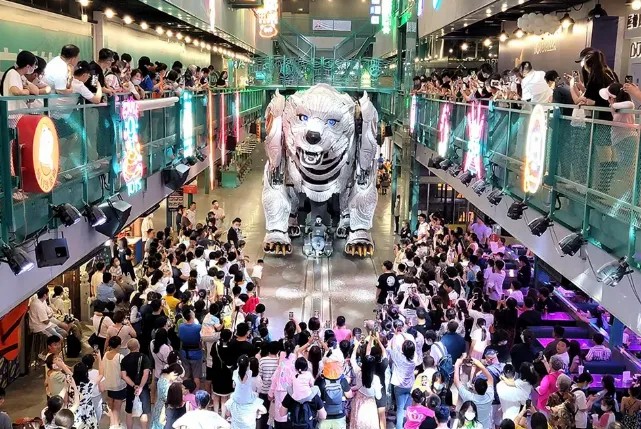 熊洞街以“大空間+小商業(yè)”為特色,匯聚了巨獸巡游、美食、娛樂、藝術(shù)、科技研學(xué)及潮玩等多元化業(yè)態(tài)。其核心IP——巨型機(jī)械白熊北北,以其震撼的體型成為街區(qū)焦點,引領(lǐng)游客穿梭于蒸汽朋克的奇妙世界。