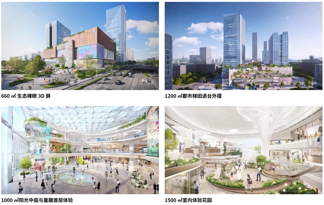 項(xiàng)目設(shè)計(jì)了若干下沉廣場(chǎng),將地下空間向城市和公園界面開放,打造具有生態(tài)層次感的庭院-花園-公園,從而實(shí)現(xiàn)地下-地面-屋頂?shù)娜讓涌臻g規(guī)劃。不僅給到了項(xiàng)目和品牌乃至這個(gè)城市更多的場(chǎng)景敘事和想象空間,同時(shí)也給消費(fèi)者帶來了更多更豐富的社交空間、沉浸體驗(yàn)空間,最終打造了一個(gè)完美的生態(tài)場(chǎng)域。