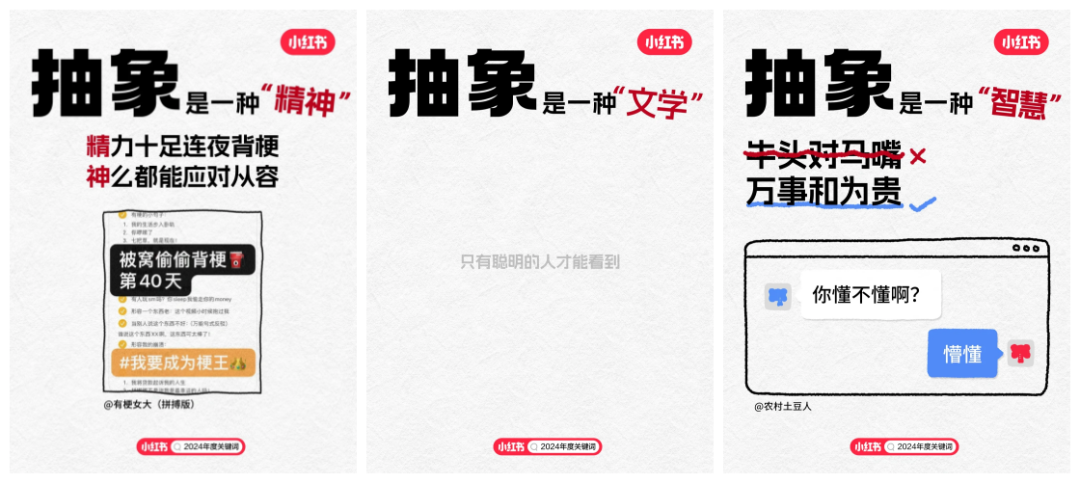 隨著2024年度關(guān)鍵詞“搞抽象”在小紅書上的火爆,我們不難發(fā)現(xiàn),無論是用戶對于生活哲學(xué)的深度探索,還是對于藝術(shù)、文化乃至日常瑣碎事物的獨特詮釋,都以一種前所未有的熱情被記錄與分享。