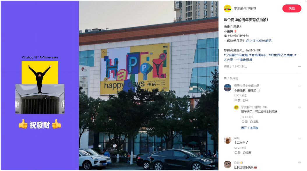 對于多數(shù)購物中心而言,因其目標(biāo)客群相對寬泛,通過抽象文化形成“群體認(rèn)同感”的難度比品牌方更高。所以,購物中心的抽象式營銷,既要出圈,又不能過于小眾。購物中心官方發(fā)布的一條小紅書筆記能讓用戶一眼看懂,并愿意發(fā)聲回應(yīng),如此才是有效“抽象”。