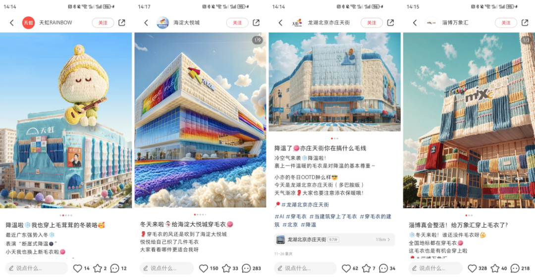 還記得今年冬天那些“穿毛衣”的購物中心嗎?首先發(fā)布的一波AI制圖“購物中心穿毛衣”海報,確實有些以假亂真,讓很多消費者看到了一群可可愛愛的商場。這些購物中心將主形象通過“穿毛衣”這一事件變得更加擬人化,靠不同的“穿搭風(fēng)格”烘起線上平臺的話題討論熱度,也讓消費者看到了官方的親近與真誠。