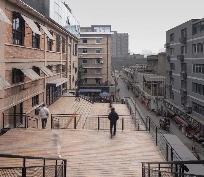 作為發(fā)起點(diǎn),現(xiàn)有菜場部分被完全保留。項(xiàng)目最核心的“修補(bǔ)”有三處:連接市場入口與1、2號樓的臺階廣場,連接地面層與2號樓屋頂?shù)慕煌ㄍ?,以及連接2號樓屋頂和3號樓的連橋。開敞的臺階廣場層層上行,不僅引導(dǎo)人流進(jìn)入上層空間,還成為了菜場公共生活的舞臺。同時(shí),廢舊廠房改造成了如今免費(fèi)開放的藝術(shù)展區(qū),這里不定期會(huì)舉辦各式不同主題的展覽活動(dòng),已經(jīng)成為新晉網(wǎng)紅打卡盛地。