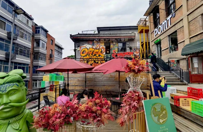其中,信義巷子主要匯集特色小鋪,一樓布滿如陜西特產(chǎn)、小磨香油、新鮮肉鋪等門面,二樓則由咖啡館、美甲店等小店組成。每家店鋪頂部都有懸掛老菜場統(tǒng)一設(shè)計(jì)的小旗幟,既和諧統(tǒng)一又各含特色;有戲主題板塊主要以脫口秀,劇本殺,婚禮,攝影及文創(chuàng)手工等工作室等業(yè)態(tài)為主,以“有戲”為名也代表著希望,象征著新銳市井文化的希望;悅夜板塊,主要匯集酒吧、民宿等多種休閑元素。尋味板塊,則提供少燒烤、韓料、特色小吃等餐飲。