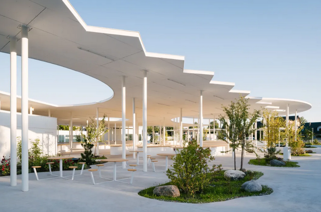 此外,廣場光滑的混凝土面層沒有路緣石,無論是步行、坐輪椅還是滑滑板都可以在市場上安全自由地移動(dòng),方便了不同人群的使用,體現(xiàn)了設(shè)計(jì)的人性化和包容性;各種街道固定裝置如白色的圓形信息板、自行車架、巨石、鳥類和昆蟲屋及社區(qū)共用桌椅等點(diǎn)綴其中。在極具特色的有機(jī)屋頂下,還設(shè)有帶木雕動(dòng)物造型搖椅的游樂花園,為集市增添了藝術(shù)氛圍和趣味性。
